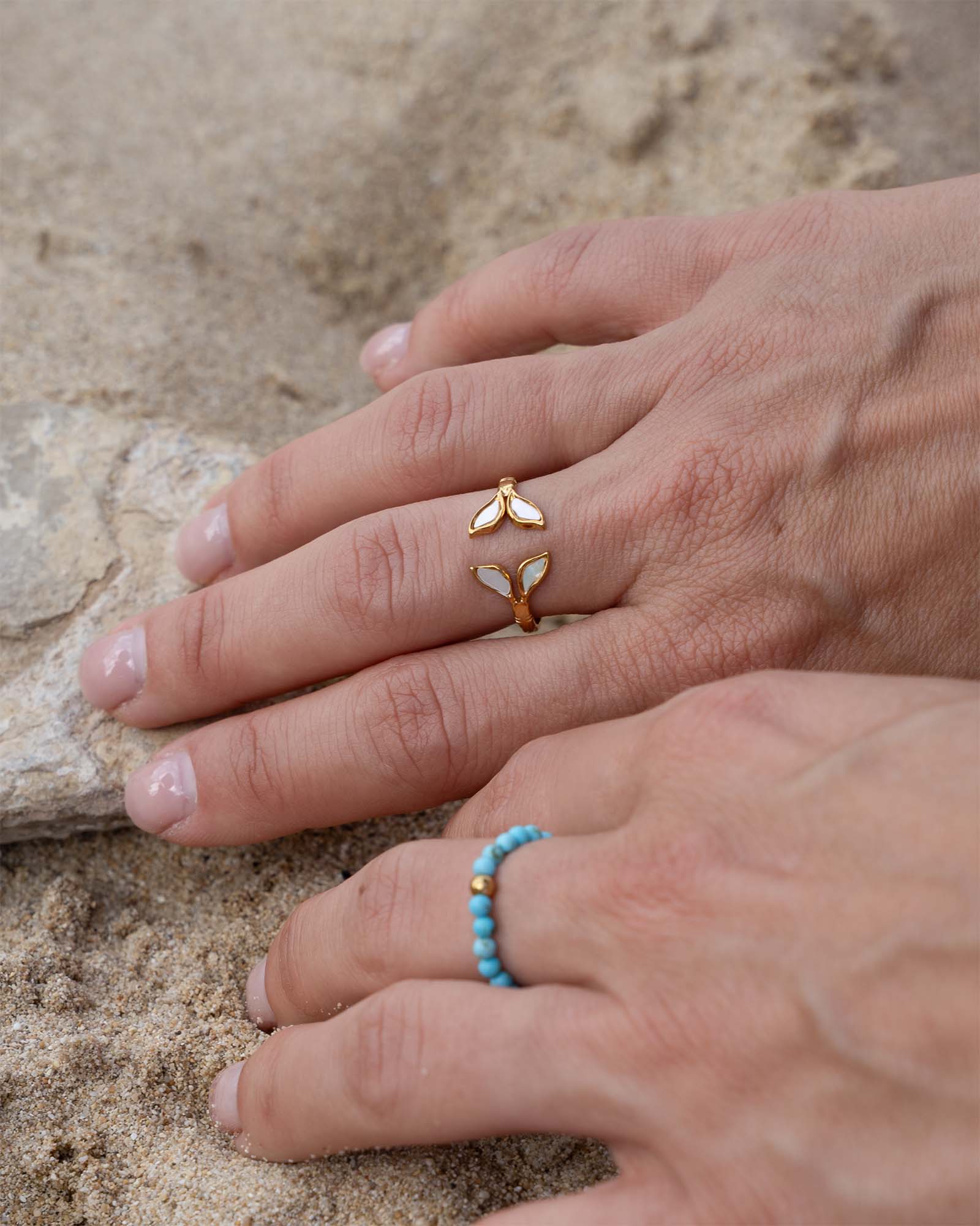 Der Ring Kaia fängt die Magie des Ozeans in einem feinen, eleganten Design ein. Die beiden zart geschwungenen Enden des Rings sind in der Form von Walflossen gestaltet – ein Symbol für Freiheit, Stärke und die tiefe Verbundenheit mit dem Meer.