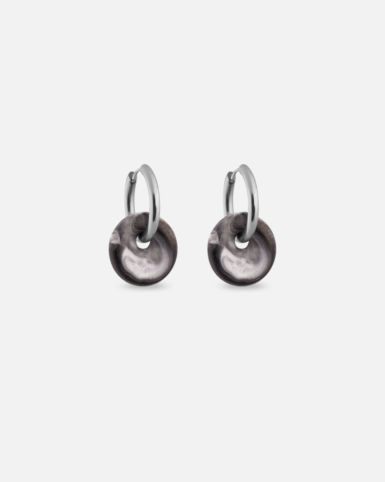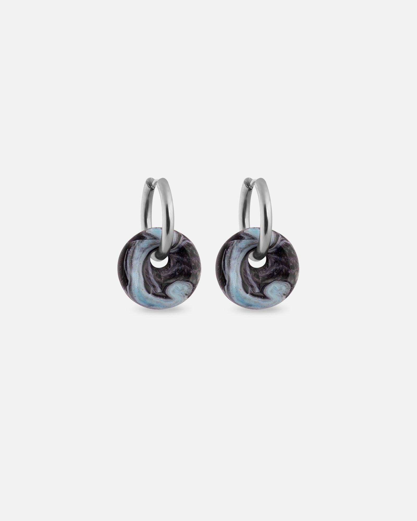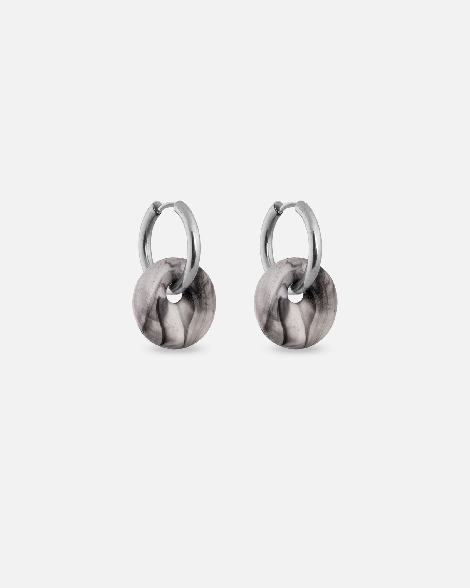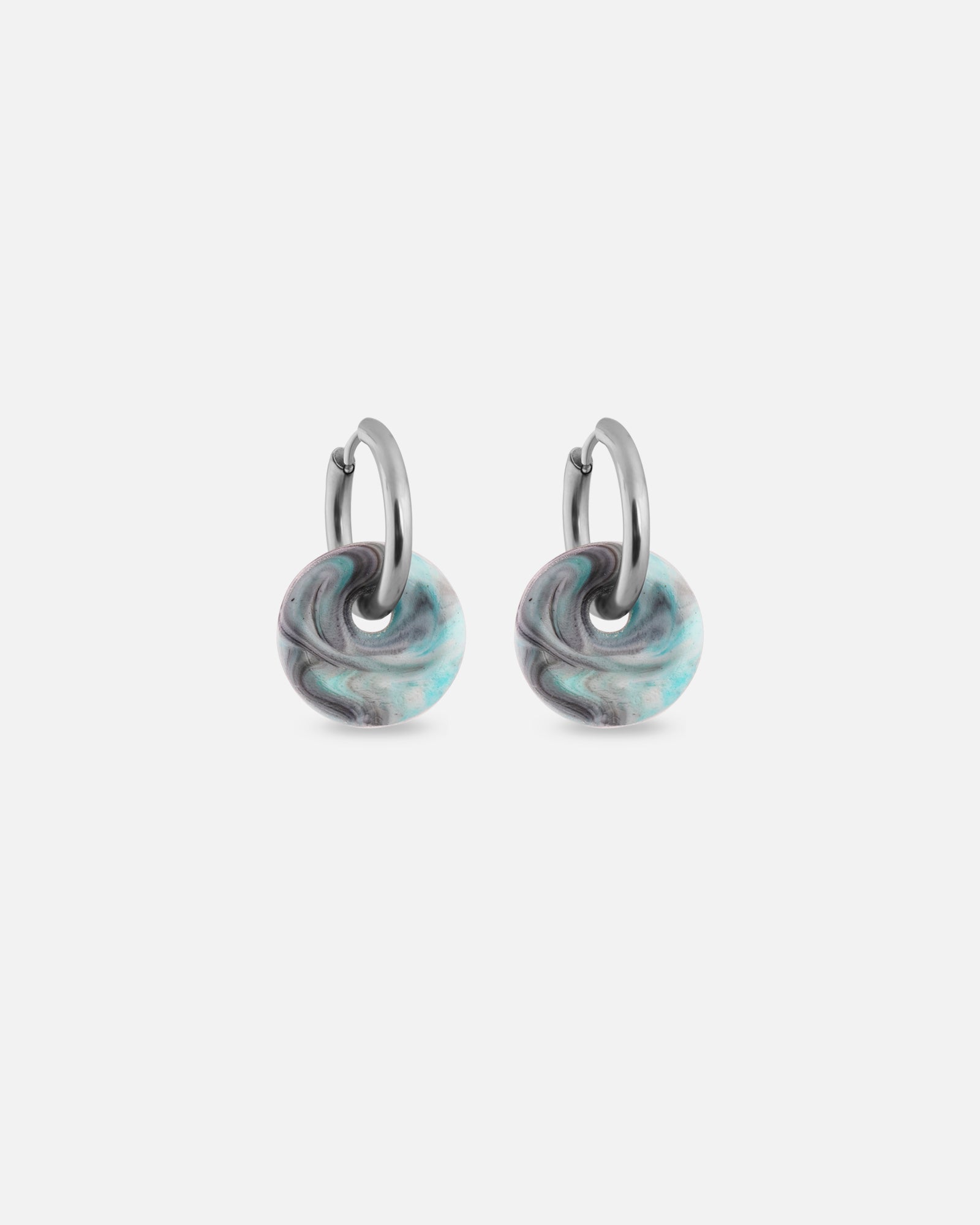 Die Ohrringe bestehen aus silberfarbenen Edelstahl-Creolen, die wasserfest, hautfreundlich und resistent gegen Schweiss, Salzwasser und Sonnencreme sind.