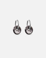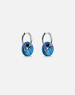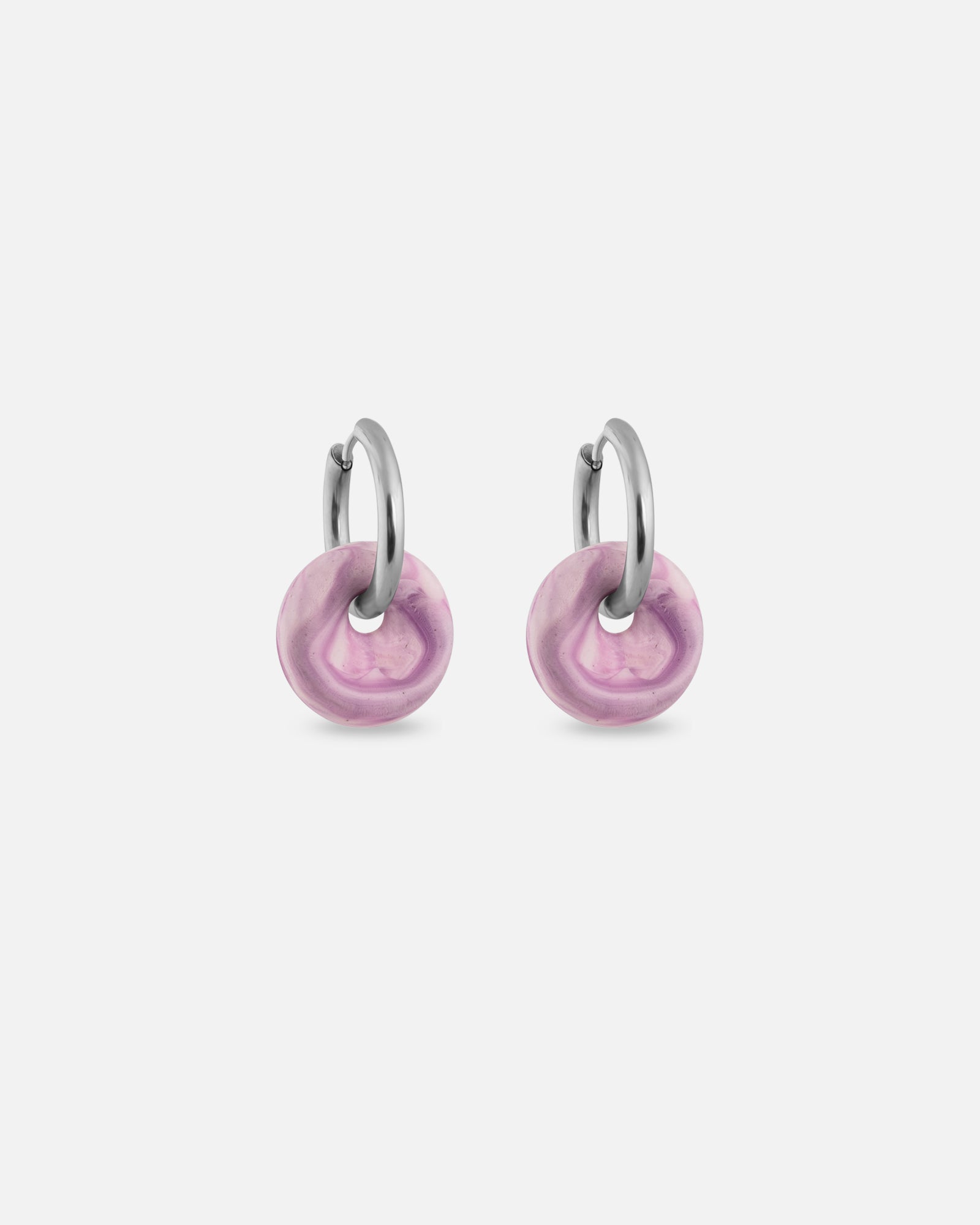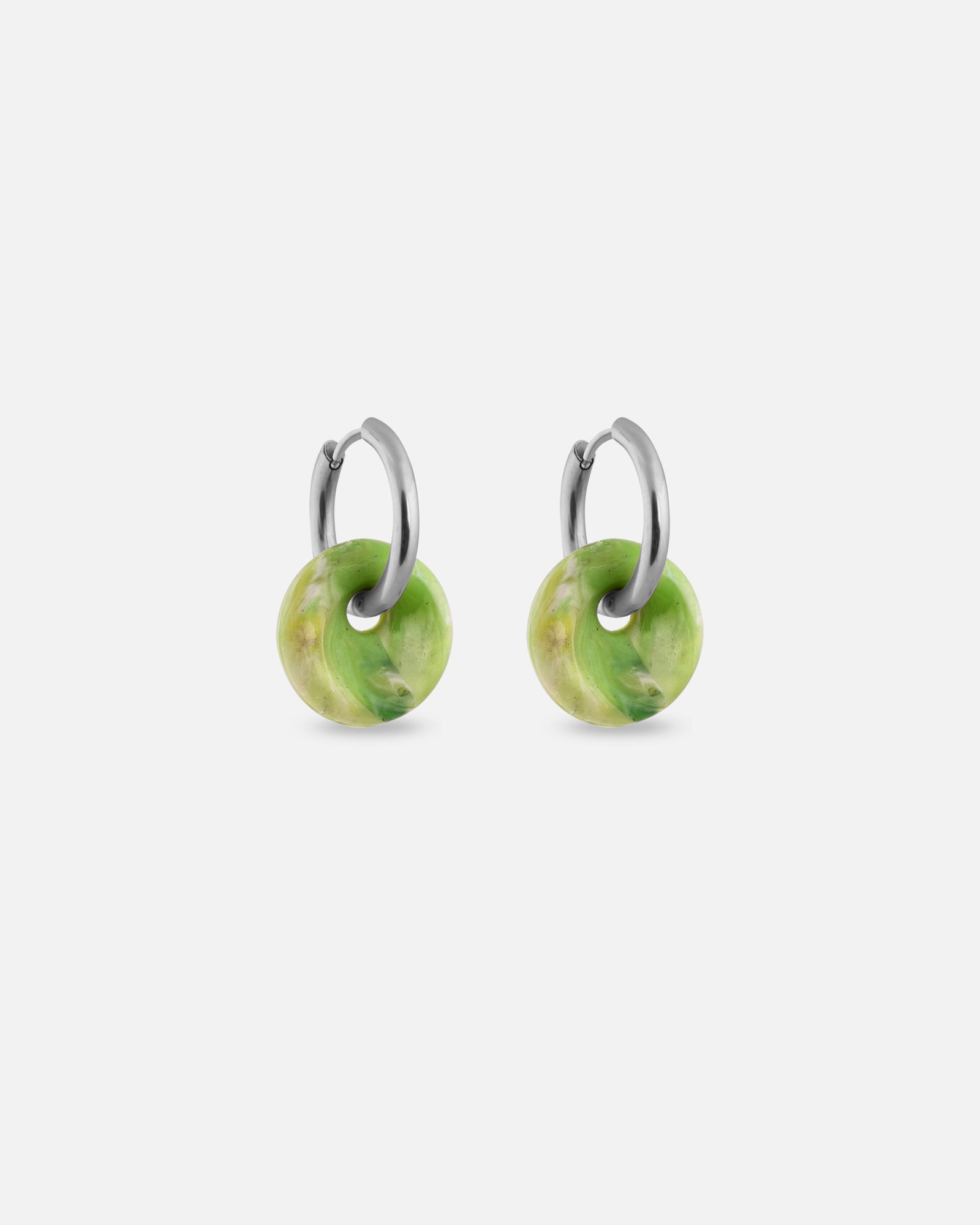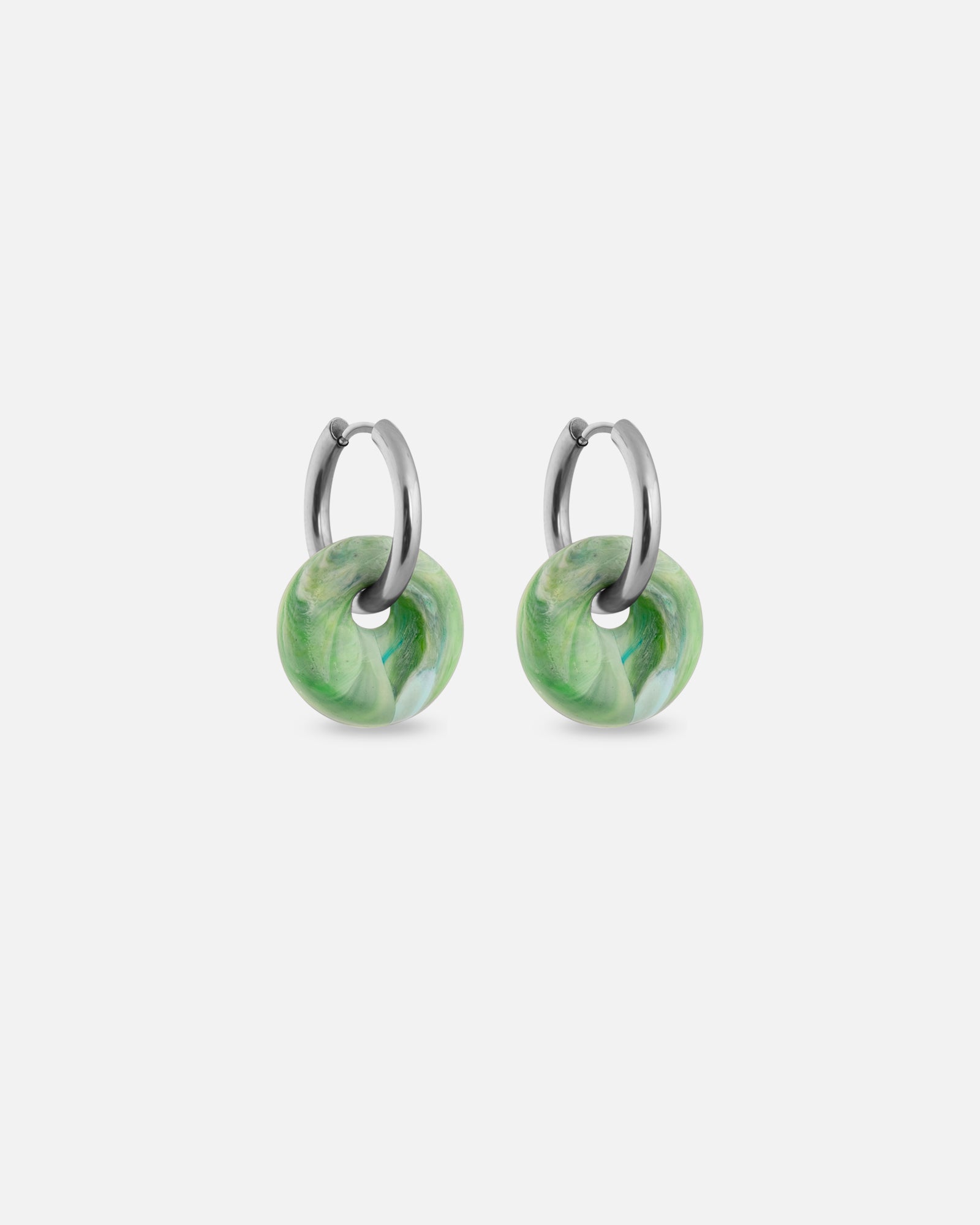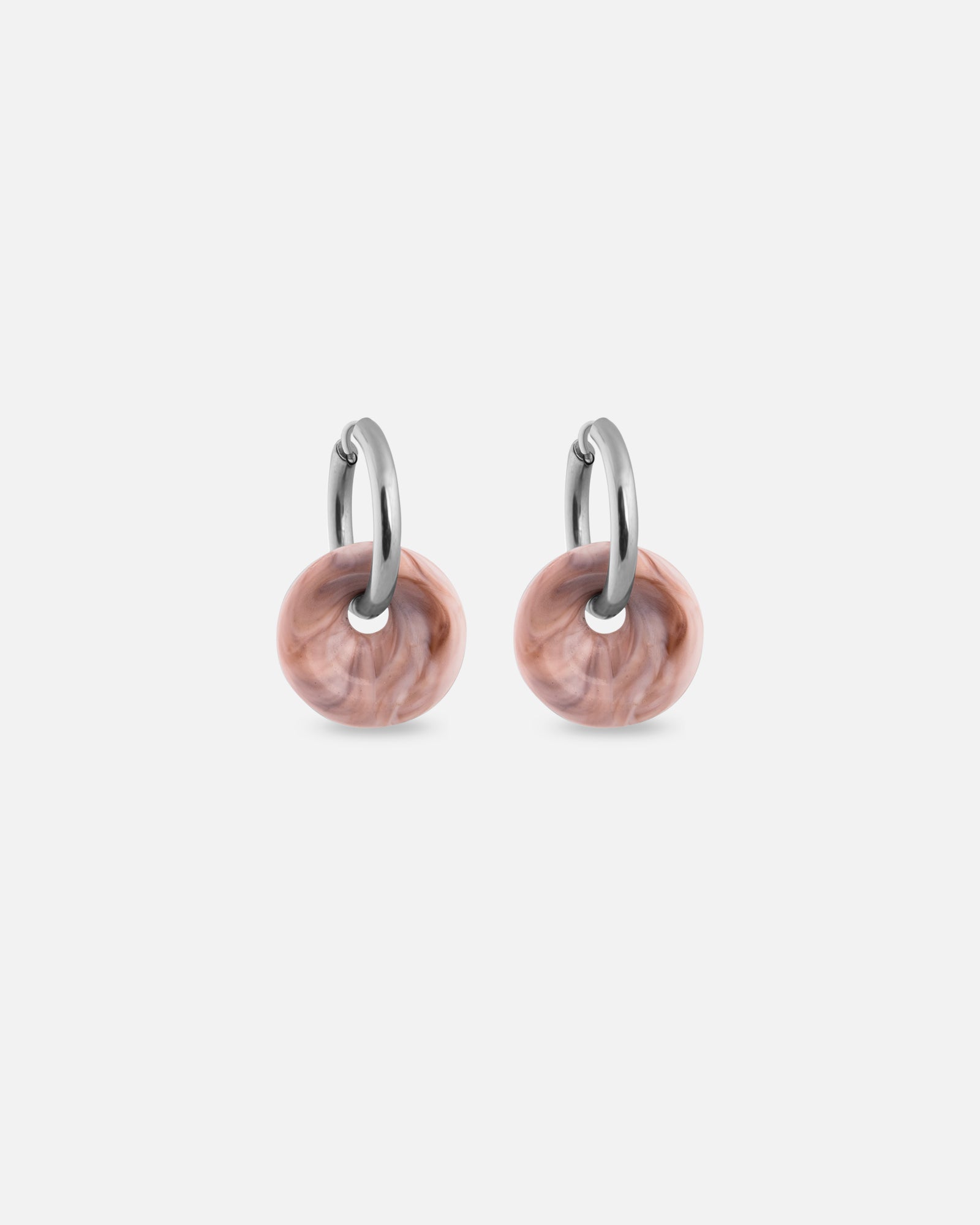 Die Ohrringe bestehen aus silberfarbenen Edelstahl-Creolen, die wasserfest, hautfreundlich und resistent gegen Schweiss, Salzwasser und Sonnencreme sind.