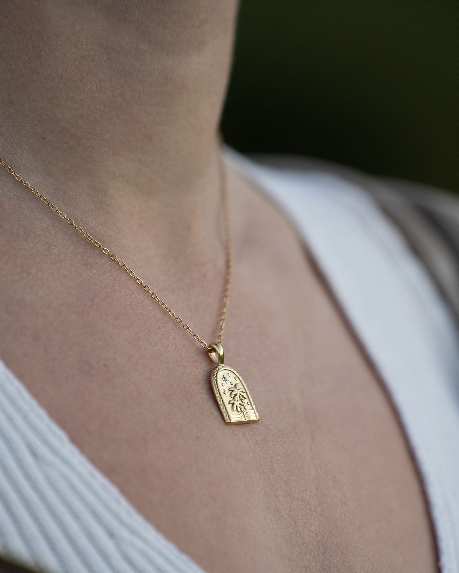 Die Kette besteht aus hochwertigem 18K vergoldetem Edelstahl und ist somit wasserfest, hautfreundlich und langlebig. Sie misst 41 cm und kann dank einer 5 cm Verlängerung individuell angepasst werden. Der Anhänger ist 14 × 18 mm gross und überzeugt durch seine feine Struktur und das warme, matte Goldfinish.