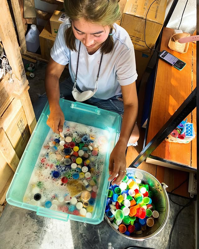 Was uns auf Koh Tao besonders inspiriert hat, war ein kleiner Shop, der Plastik sammelt und wiederverwertet. Menschen bringen ihr gesammeltes Plastik dorthin oder nehmen an Beach Cleanups teil – auch wir durften schon mithelfen. Das gesammelte Material wird nach Farben sortiert, erhitzt und in neue Formen gegossen.