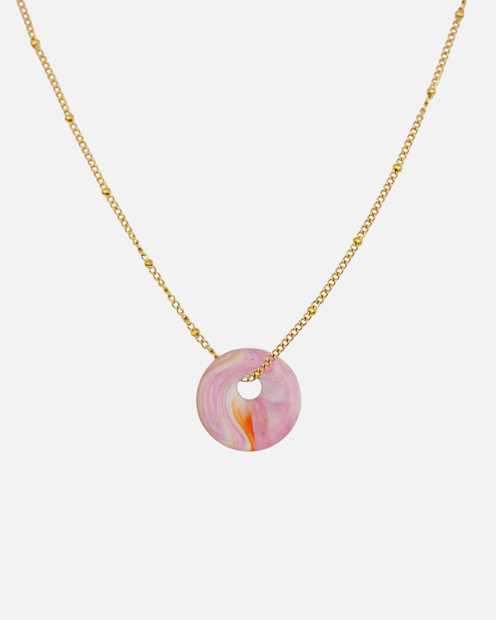 Der Mali Charm – eine zeitlose Donut-Form – wird auf Koh Tao aus recyceltem Meeresplastik gefertigt. Jede Farbe, jedes Muster und jeder Wirbel entsteht beim Pressen individuell, sodass jede Halskette ein echtes Unikat bleibt.